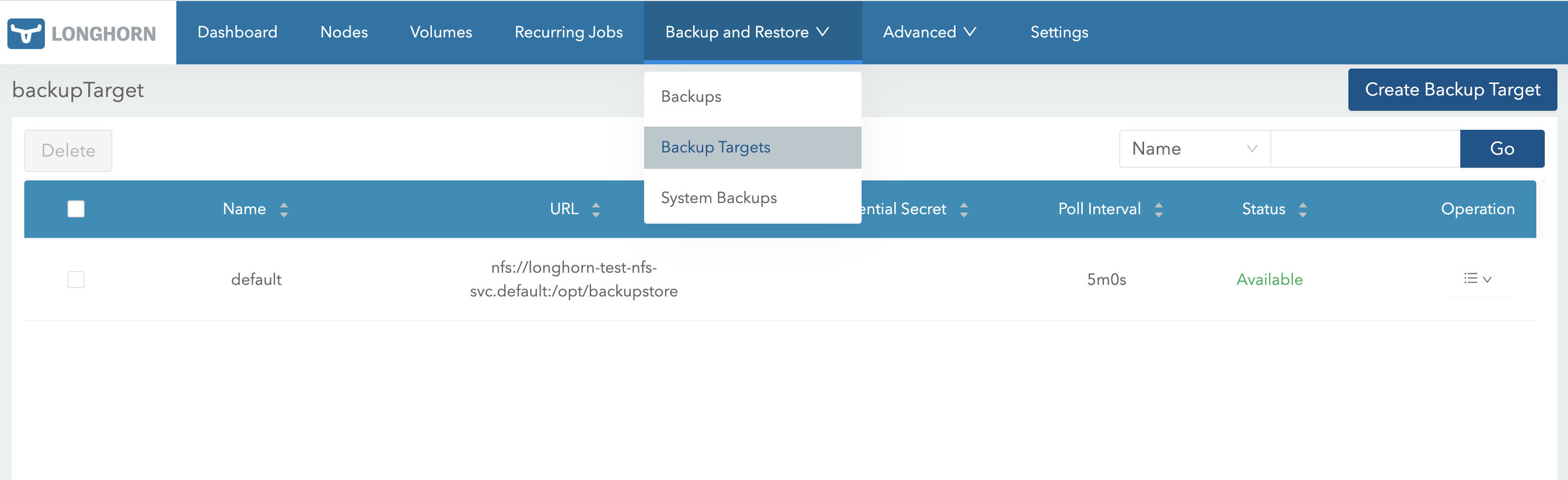 On the Longhorn UI, go to Backup and Restore > Backup Targets.